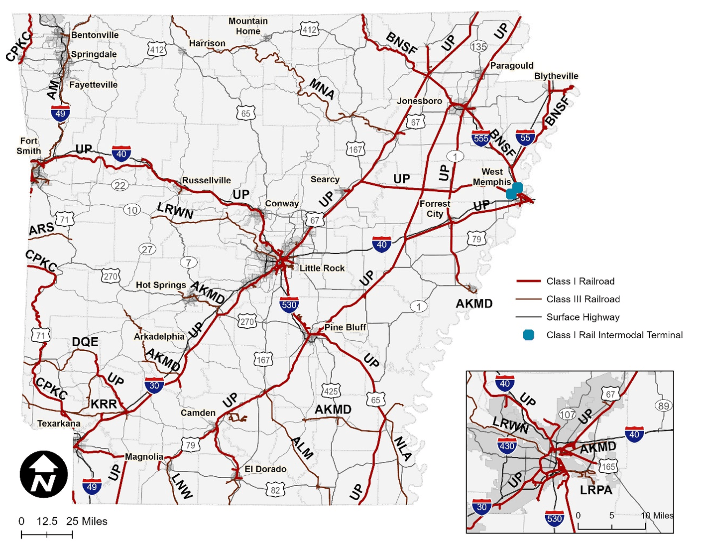 Arkansas has almost 2,600 miles of track and is home to three Class I rail systems: Union Pacific, BNSF Railway, and Kansas City Southern Railway. Union Pacific Railroad operates major yards in Little Rock and Pine Bluff, along with a locomotive overhaul and maintenance facility in North Little Rock. They also have a $70 million state-of-the-art intermodal facility on 600 acres at Marion, just north of where Interstates 40 and 55 converge.